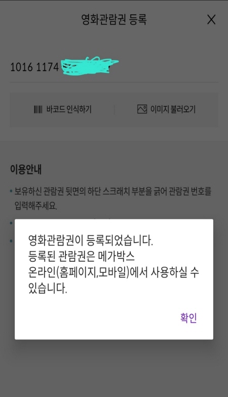 아래 이미지에 메가박스관람권에 등록한 초대권이 보이게 됩니다.